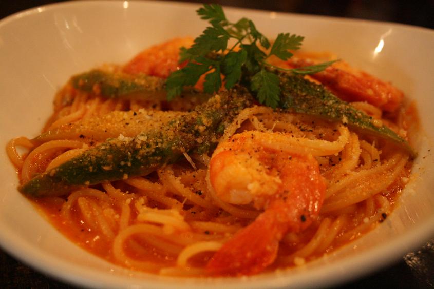 ぷりぷり海老とアスパラのトマトクリームパスタ