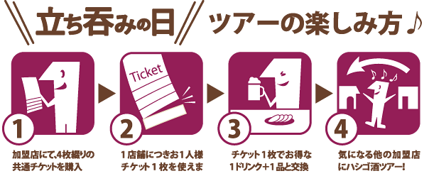 「立ち呑みの日 ハシゴ de ナイト」。11月7、8日の2日間に渡って開催され、新橋、神田、田町、北千住、京成立石、中目黒、渋谷、三軒茶屋、吉祥寺、人形町、西荻窪の11エリア、約200店の立ち飲み店を中心とした飲食店が参加。客は4枚つづりのチケット(2500円)を購入して、これらの店ではしご酒ができるという、大変に魅力的な企画です!